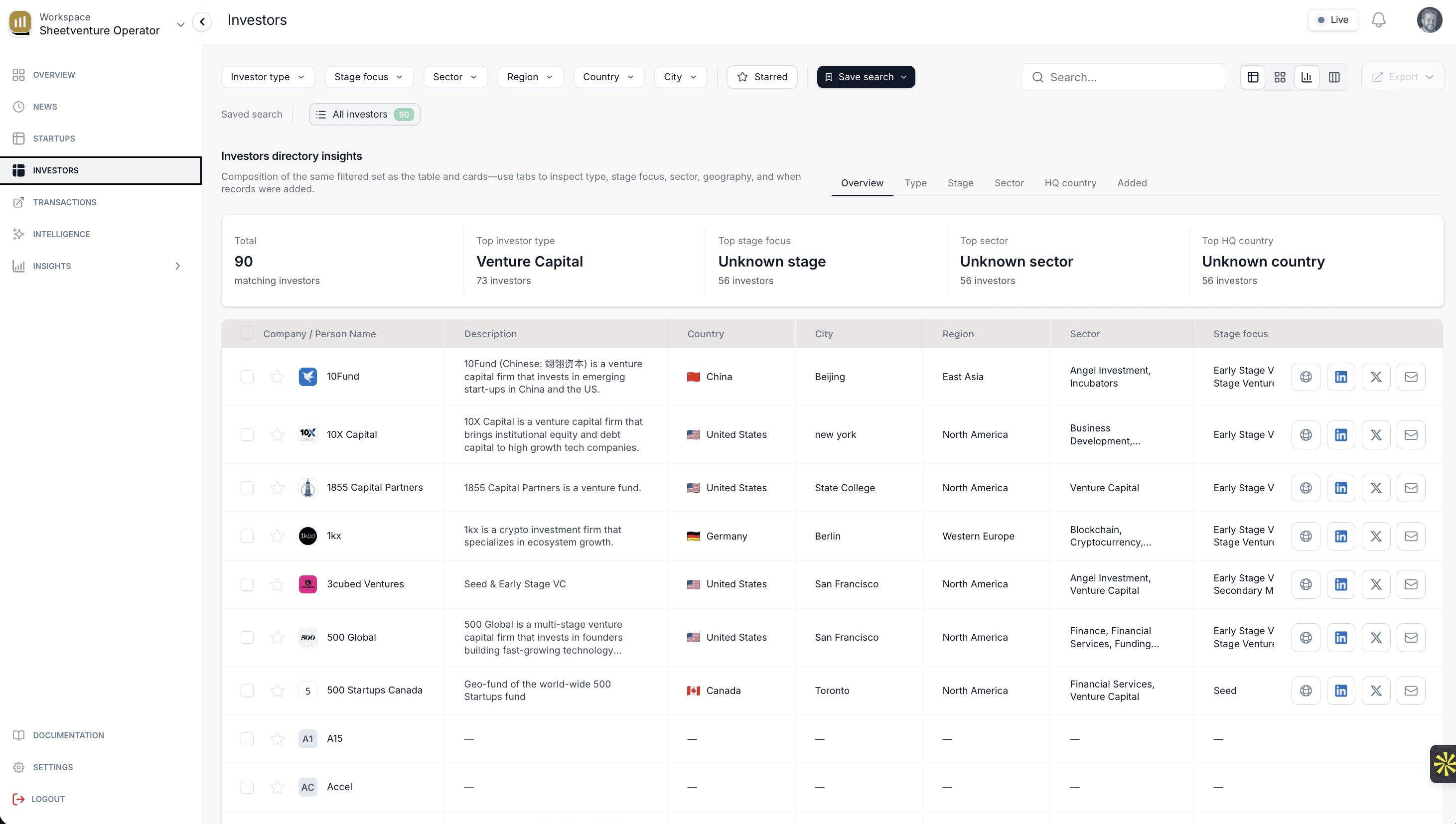 Your direct line to active VCs, PEs, angels, and recently funded startups. Filter by stage, sector, geography, and actual vc activity worldwide to track funding rounds and venture investment opportunities.