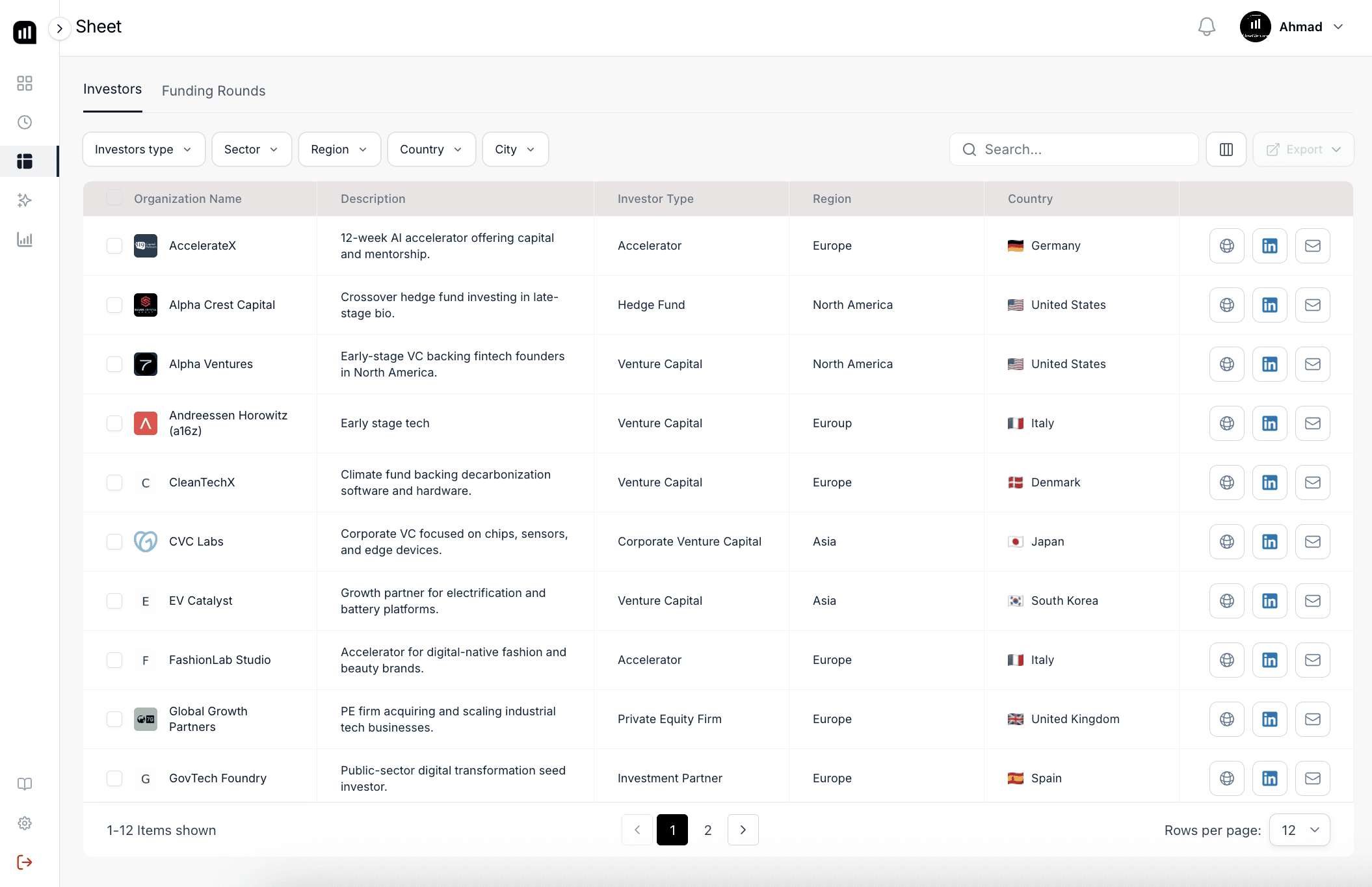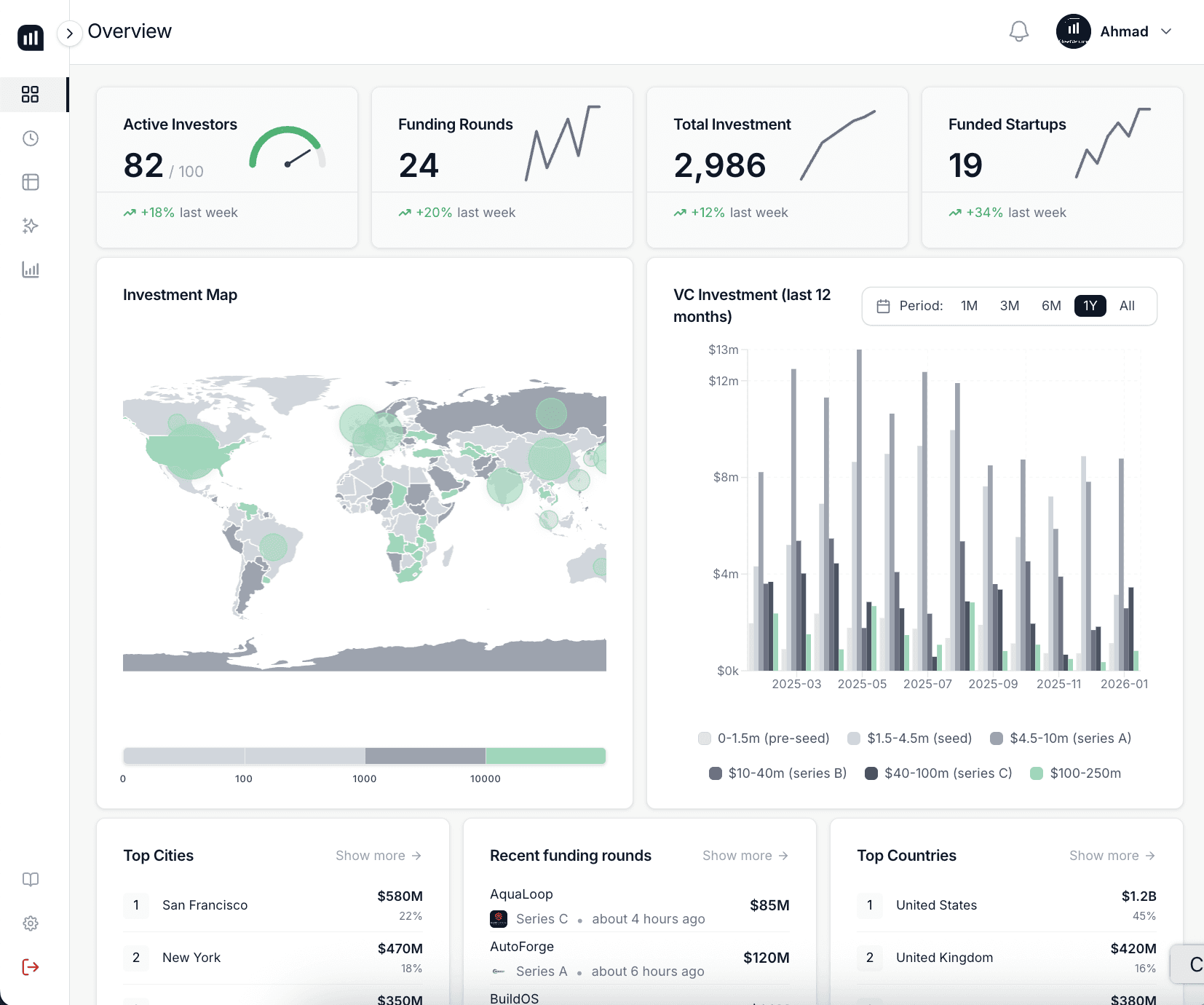 Your direct line to active VCs, PEs, angels, and recently funded startups. Filter by stage, sector, geography, and actual deal activity worldwide.