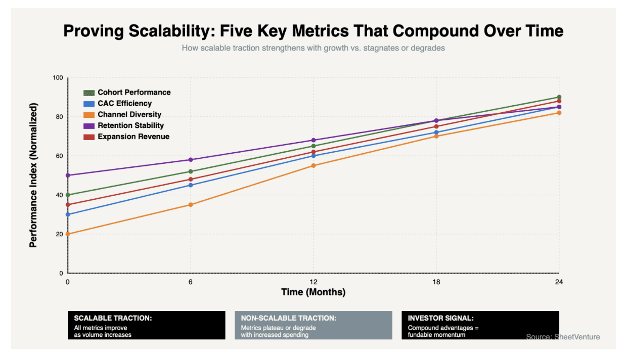 Founders prove scalability through five evidence types: cohort performance improving over time, CAC decreasing with volume, multiple acquisition channels working profitably, retention curves flattening at healthy levels, and expansion revenue accelerating.