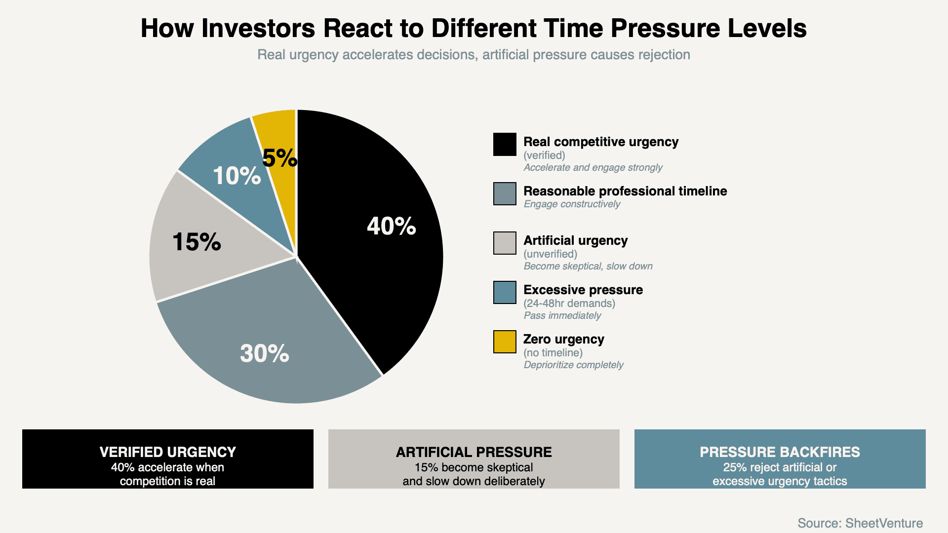 Investors react to time pressure based on perceived authenticity: real competitive dynamics accelerate decision-making, artificial pressure triggers skepticism, excessive urgency signals desperation, reasonable timelines demonstrate professionalism, and zero urgency suggests weak demand.