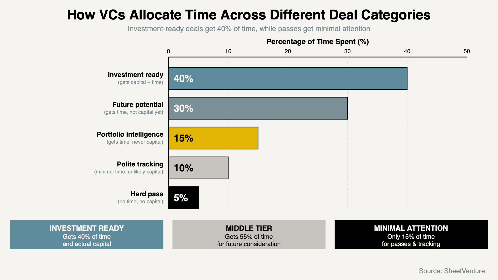 The pattern: VCs spend 45% of their time on deals they're not investing in currently, tracking future potential and gathering portfolio intelligence. Time allocation reveals true assessment of long-term potential versus polite rejection.