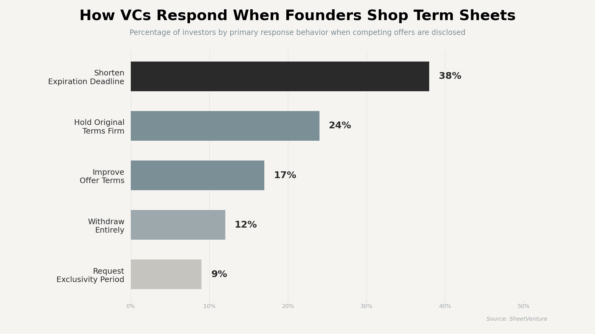 VCs expect competitive processes. They do not expect manipulation. When founders shop term sheets transparently, 17% of investors improve their offers, and most hold firm or compress timelines. When founders fabricate urgency or pit investors against each other dishonestly, 12% withdraw entirely, and reputational damage follows. The VC community is smaller than founders realize. Partners at competing firms share notes, compare deal flow, and remember founders who played games.