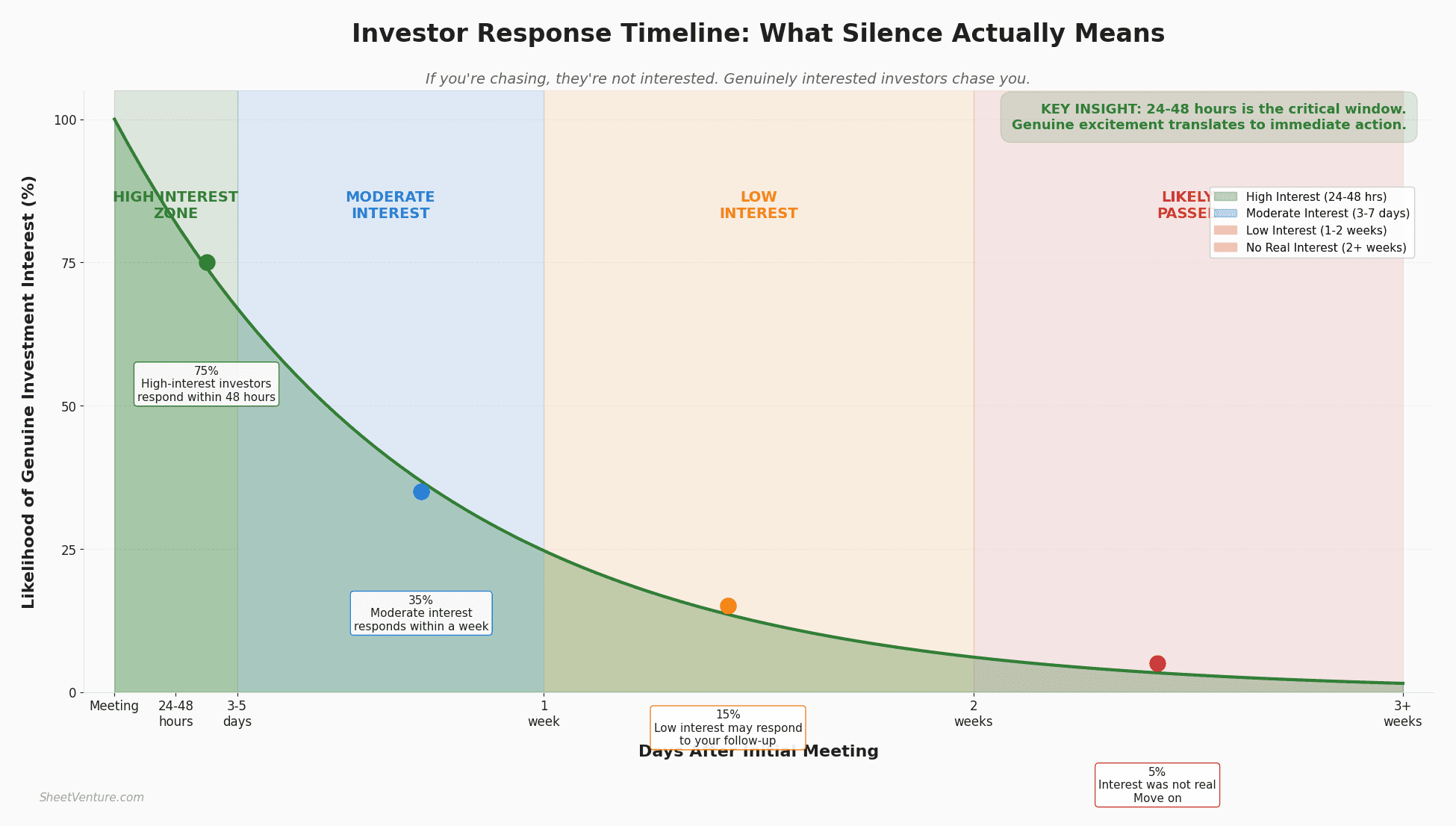 Investor interest without follow-up typically signals polite rejection, deprioritization, or "soft pass" not genuine investment intent.