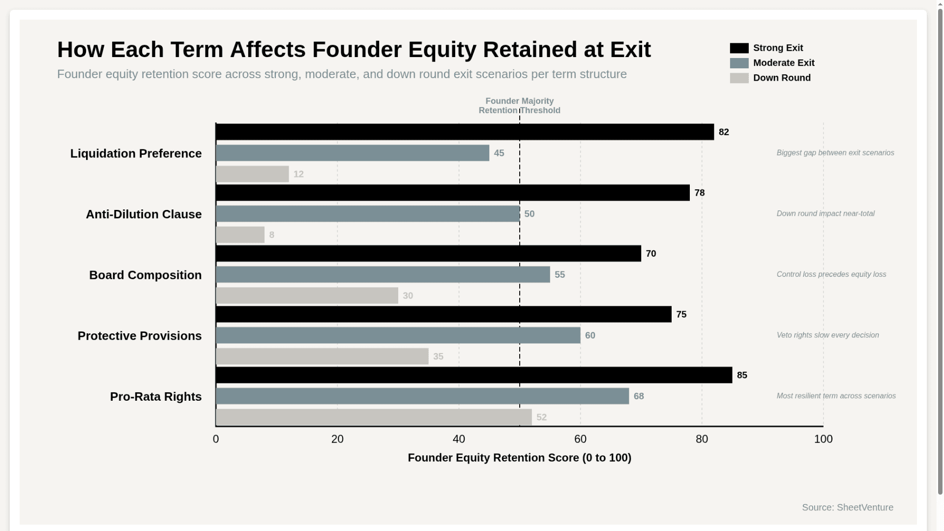 The pattern: Terms that appear minor in a strong exit produce catastrophic outcomes in moderate or down round scenarios. Founders who negotiate exclusively for the strong exit case accept terms that destroy outcomes in every other scenario.